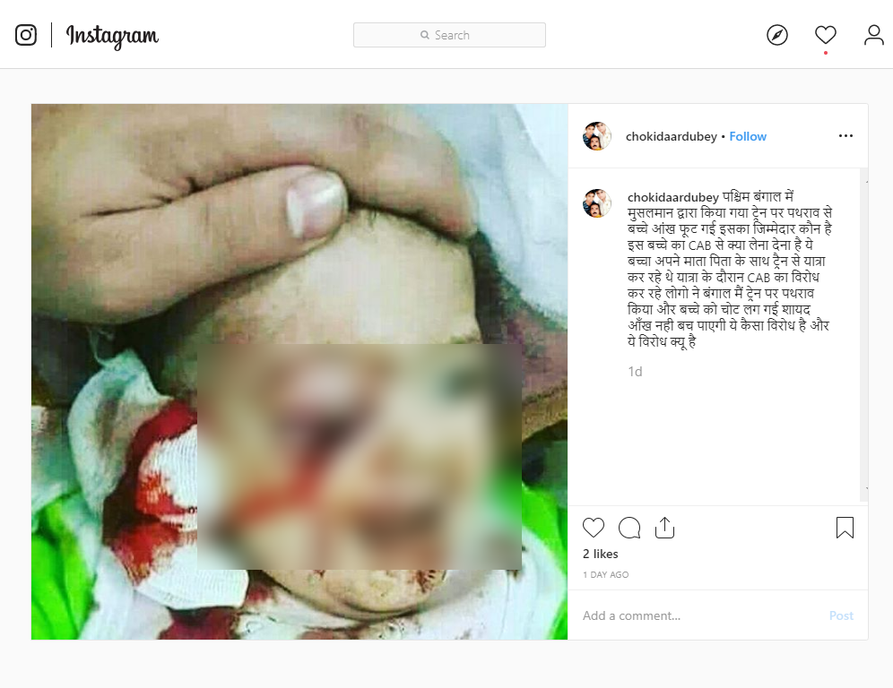 The message shared with the image is as follows: “पश्चिम बंगाल में मुसलमान द्वारा किया गया ट्रेन पर पथराव से बच्चे आंख फूट गई इसका जिम्मेदार कौन है इस बच्चे का CAB से क्या लेना देना है ये बच्चा अपने माता पिता के साथ ट्रैन से यात्रा कर रहे थे यात्रा के दौरान CAB का विरोध कर रहे लोगो ने बंगाल मैं ट्रेन पर पथराव किया और बच्चे को चोट लग गई शायद आँख नही बच पाएगी ये कैसा विरोध है और ये विरोध क्यू है (A toddler’s eye was damaged by Muslims in West Bengal who were pelting stones on a train. Who is responsible for this? What is this child’s connection with CAB? He was commuting with his mom and dad in the train when during protests in West Bengal, stones were pelted at the train and the child was hurt. Perhaps his eye will not be saved. What kind of protest is this? Why is it happening?)”