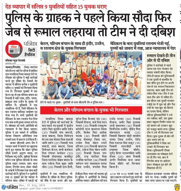 “देह व्यापार में संलिप्त 9 युवतियों सहित 15 युवक धराए (Nine young women along with 15 young men involved in sex racket nabbed -translated)”, reads the headline of the article published by Patrika on July 15, 2019. According to the report, police took action against a redlight area located on Lebad-Nayagoan four-lane road.