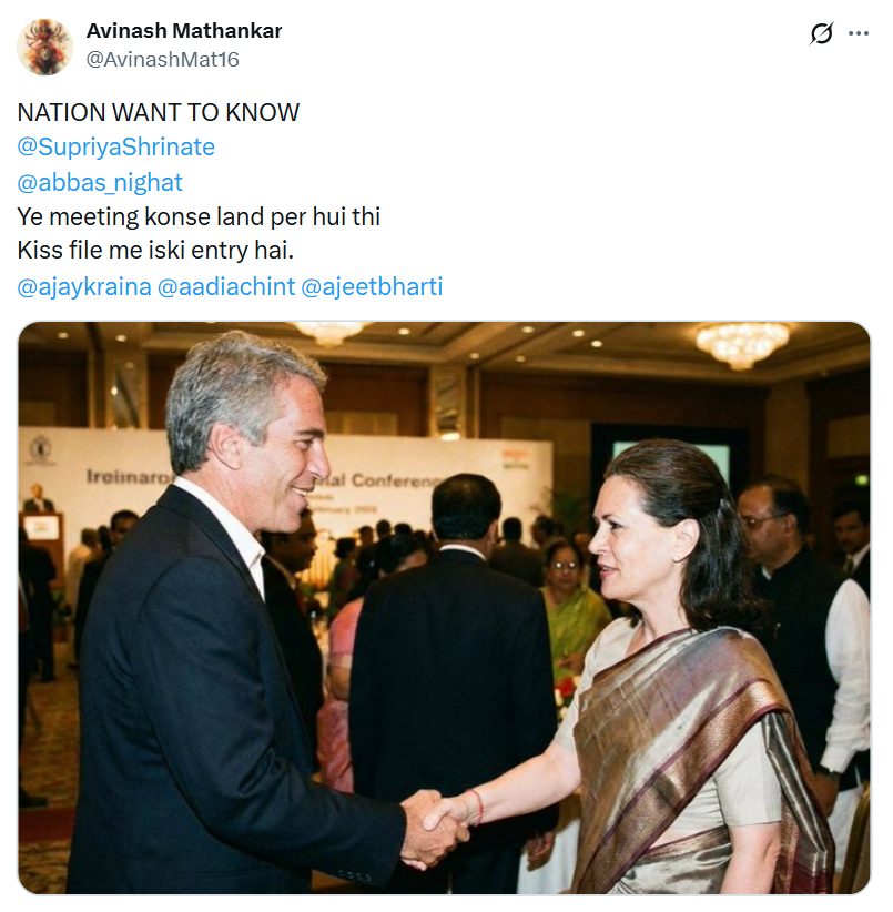 A photo is viral on social media showing Congress leader Sonia Gandhi shaking hands with the late Jeffrey Epstein, an American financier and convicted sex offender.