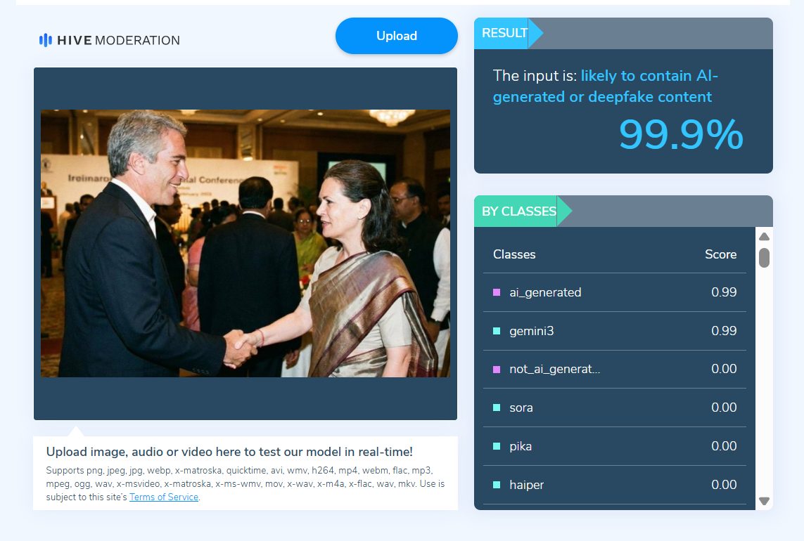 To sum up, the viral photo apparently showing Sonia Gandhi shaking hands with American financer and convicted sex offender Jeffrey Epstein is AI-generated.