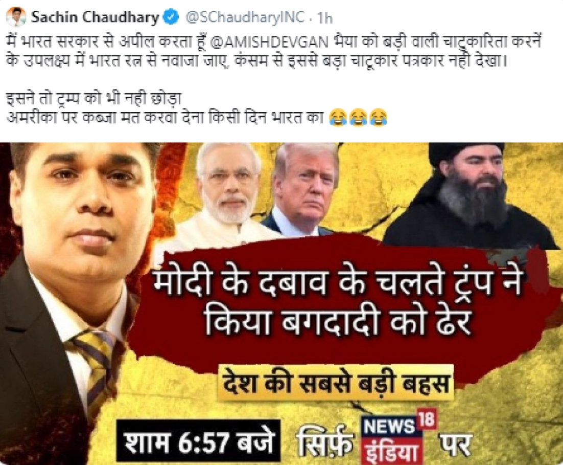 A photoshopped News18 graphic was shared to claim that anchor Amish Devgan aired a show crediting PM Modi for ‘pressuring’ American president Donald Trump to take down ISIS leader Abu Bakr Al Baghdadi.