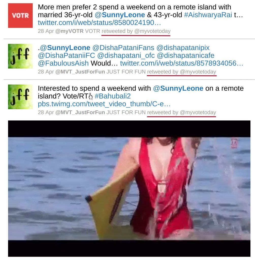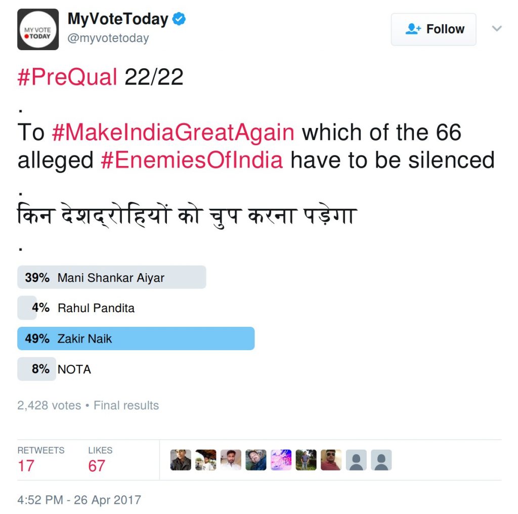 MyVoteToday Twitter account is routinely abusive as well even when not running polls. When Congress spokesperson Priyanka Chaturvedi objected to MyVoteToday running a poll as to who is the ‘hottest’ spokesperson, MyVoteToday’s response was anything but civil. They later deleted this abhorrent tweet.
