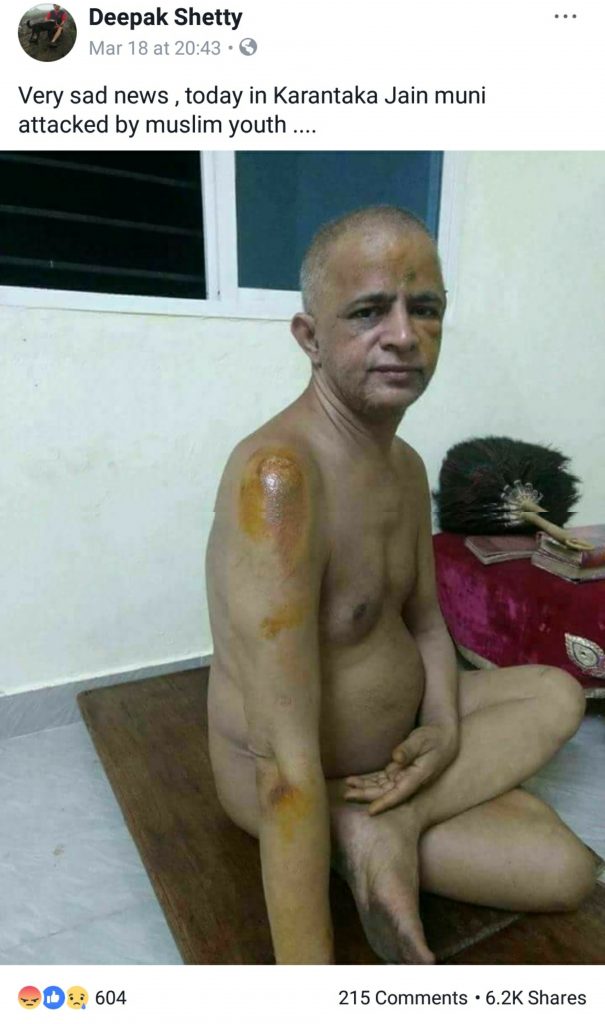 The photo of the man with an arm wound was also widespread in 2018 ahead of elections in Karnataka. “Very sad news, yesterday in Karantaka Jain muni attacked by muslim youth …. No one is safe in Siddaramaiah’s Karnataka [sic],” was the message circulating back then.