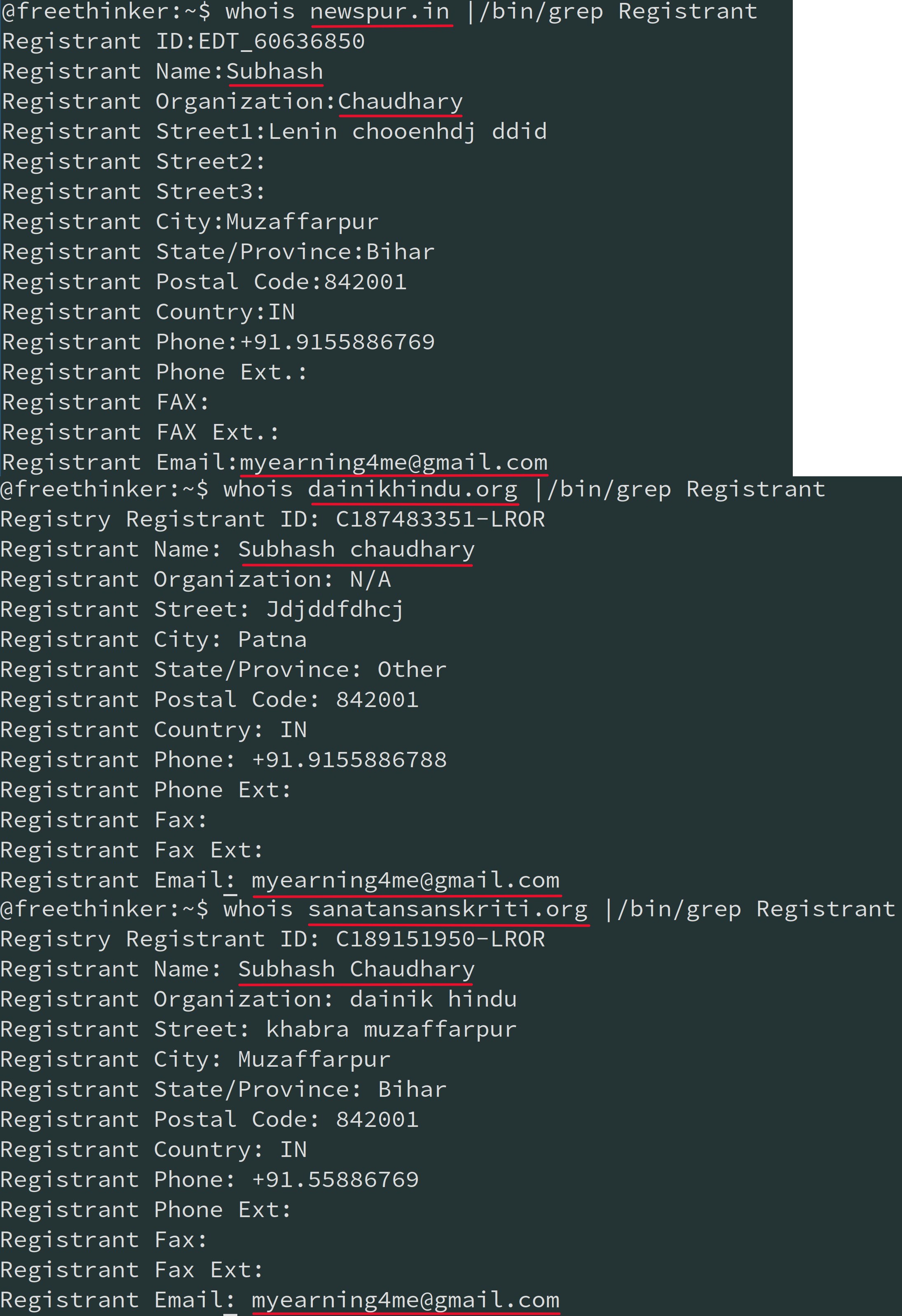 The next task was to find out who owns this website. Most operating systems provide a tool called ‘whois’ which is a command line tool which helps one determine the ownership of a website (domain). As it turns out, the owner of newspur.in, Subhash Chaudhary, owns atleast 2 other domains namely sanatansanskriti.org and dainikhindu.org and the whois output shown below establishes the same. (Ignore the info below in the image below if it seems too technical)
