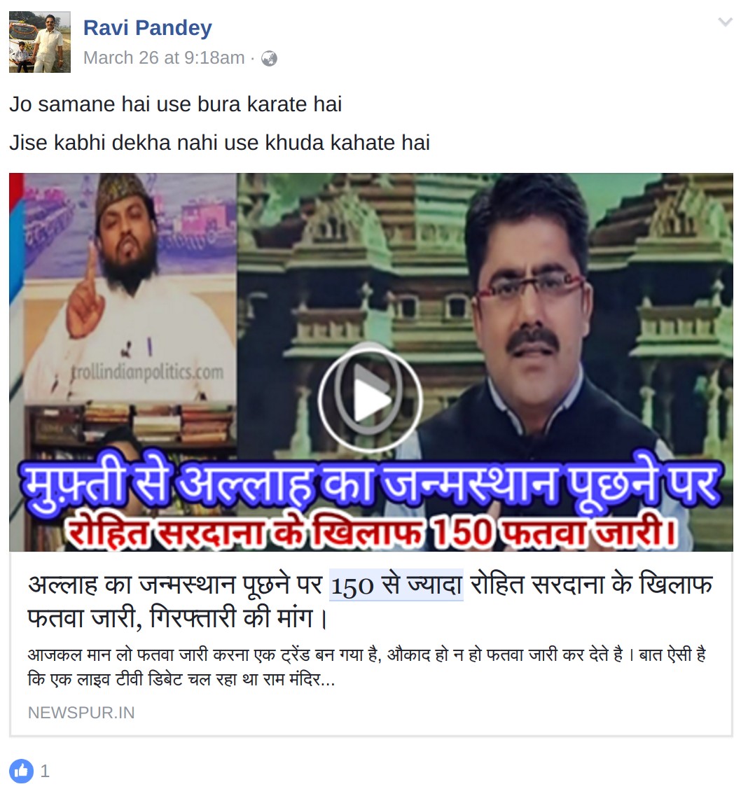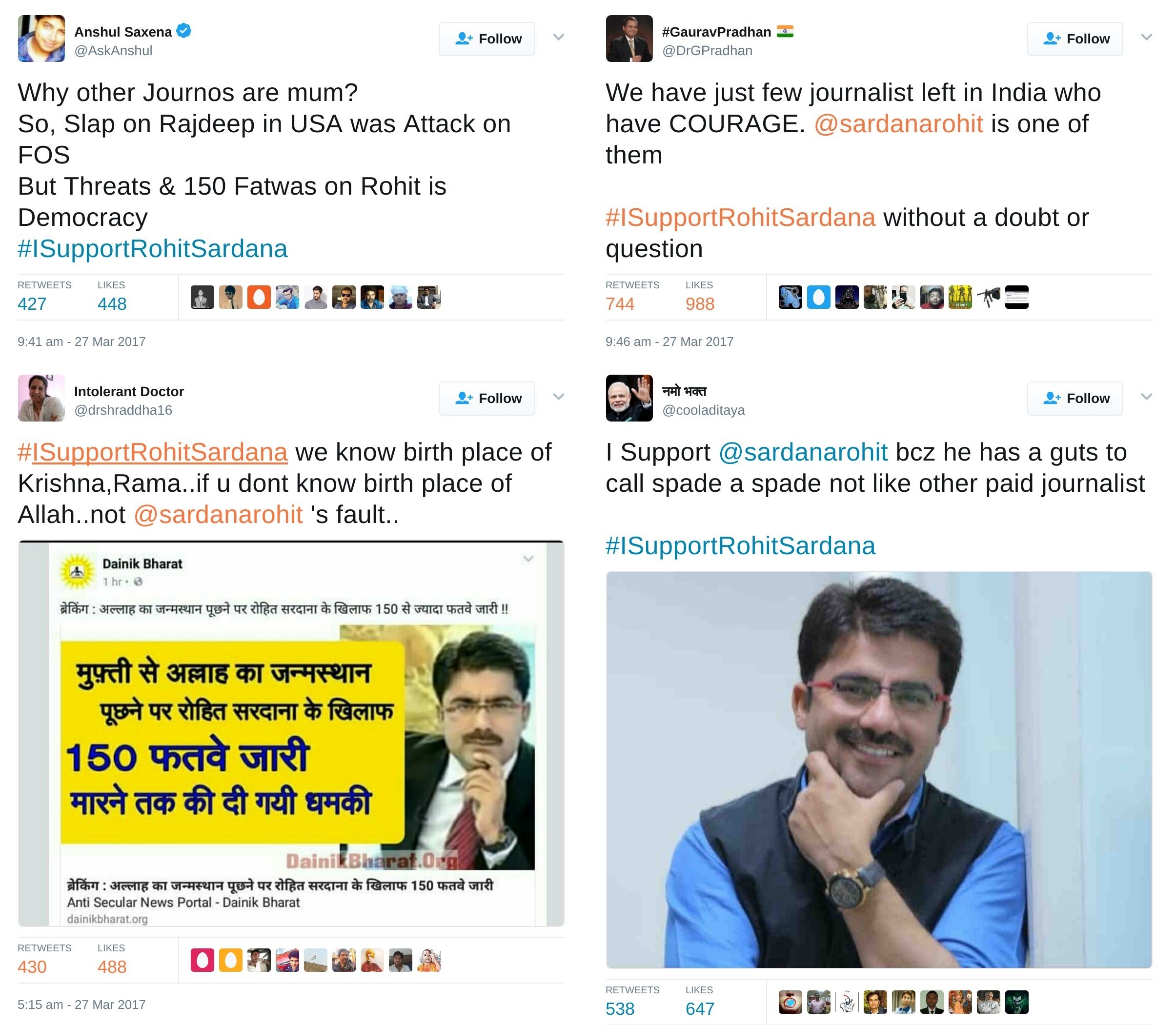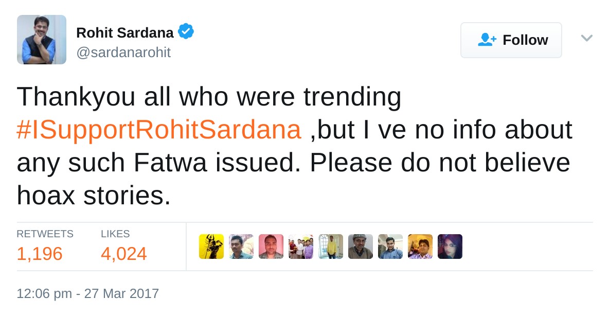 A twitter hashtag #ISupportRohitSardana trended for a long time on 27th March, Rohit Sardana being the star anchor of Zee News and a huge favourite of Modi supporters. Why the sudden support for Rohit? According to right-wing claims, 150 Fatwas were issued against Rohit Sardana in response to Rohit Sardana asking a Maulana for Allah’s proof of birth in his show. Many of the tweets in support of Rohit Sardana got 100s of retweets. Here’s a sample.