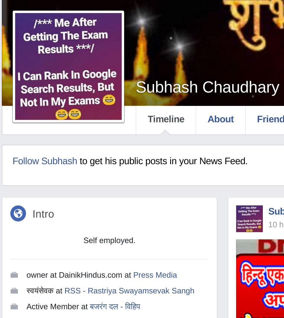 So, why does Subhash Chaudhary have to run these fake news/information portals? What is the inspiration? Apparently, it is the advertisement money that he gets out of his websites. We found the link to Subhash Chaudhary’s Facebook profile on his website newspur.in => https://www.facebook.com/aslisubhash. His profile says that he’s an active member of Rashtriya Swayamsevak Sangh, Bajrang Dal and VHP.