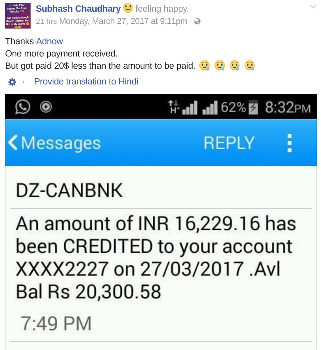 A recent post on his timeline with the status “feeling happy” shows his jubiliation at receving some Rs 16,000 from a company called Adnow via which advertisements are shown on his posts, with 80% of the page filled with advertisements.