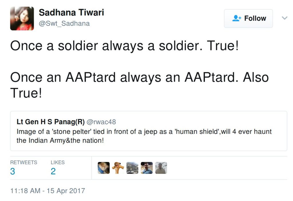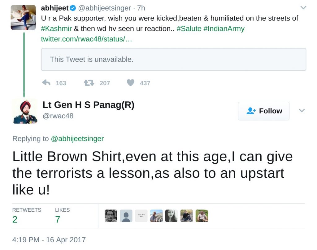 Fast forward to 2017, a video went viral on social media in which a Kashmiri man, who had come to cast his vote, was tied to the front of the jeep and paraded through several villages by the Indian army. By the time, Farooq Ahmad Dar got back home in the evening, he had a broken arm and was completely traumatised. Criticising this incident, retired Lieutenant General Harcharanjit Singh Panag posted a tweet on his Twitter timeline (@rwac48). Lt General Panag is the former Commanding officer of the Northen Command and Central Command of the Indian Army, is the only three-star General from the Mechanised Infantry and has won multiple awards.