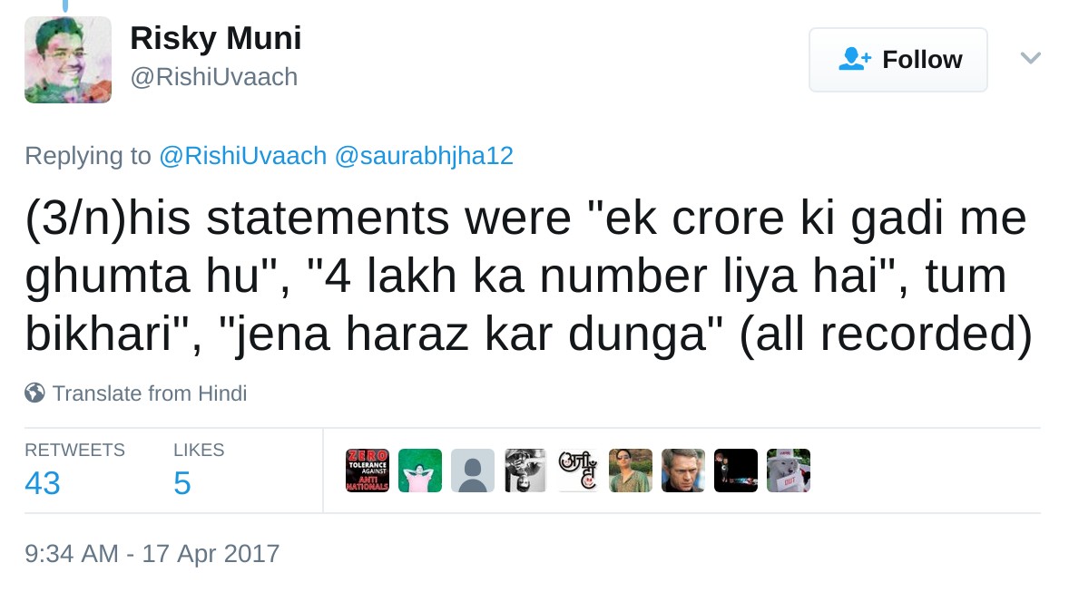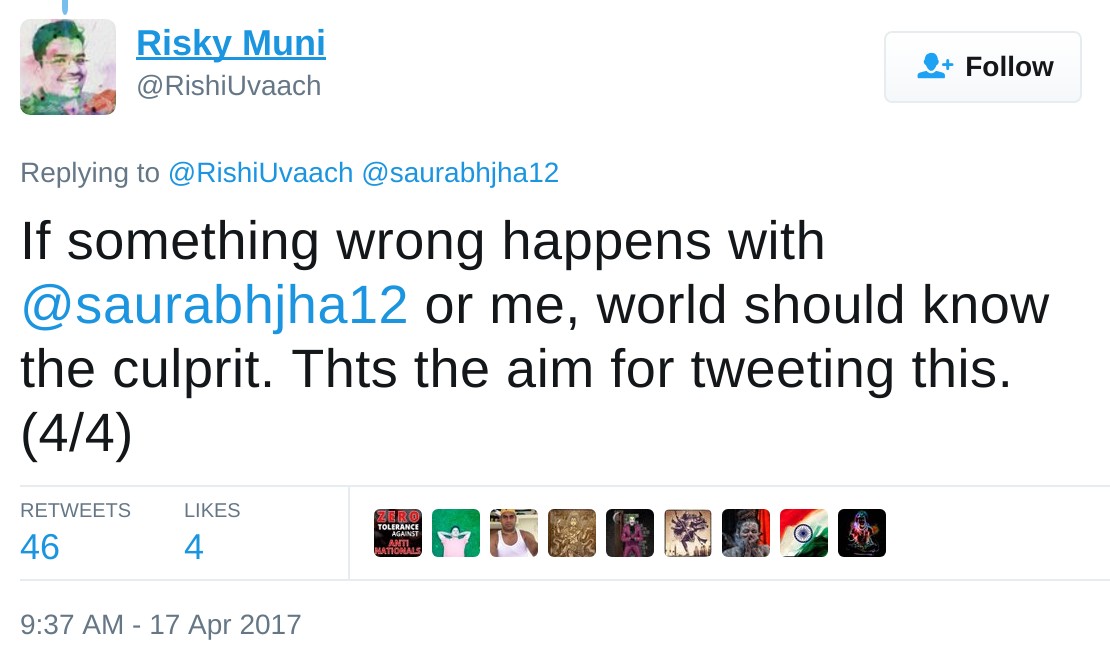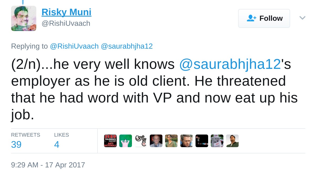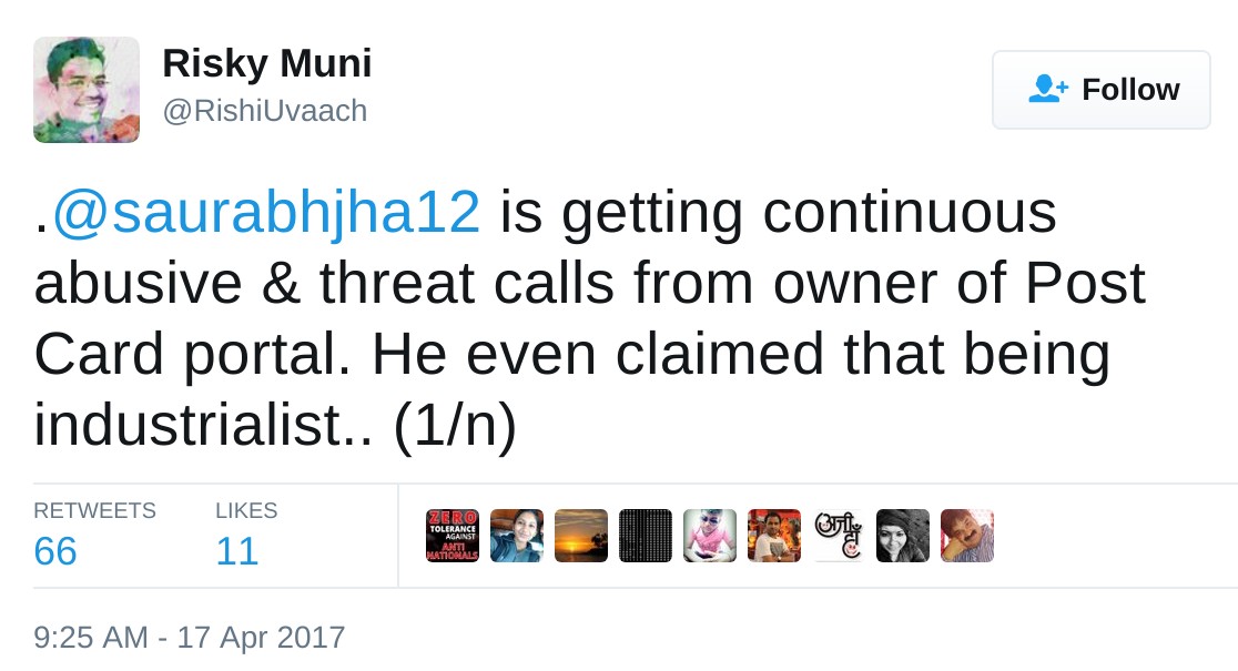 A few days ago, a Twitter user, @rishiuvaach tweeted that another user, Saurabh Jha (@saurabhjha12), is getting abusive and threatening calls from owner of the postcard news portal. “If something wrong happens with @saurabhjha12 or me, world should know the culprit”, he tweeted.