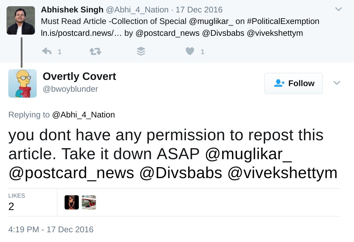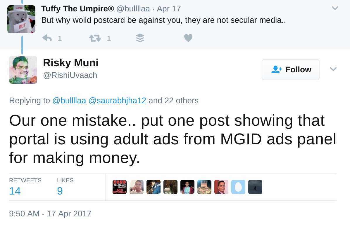 This accusation was denied by Postcard News and it is not clear how it escalated into the alleged threats. When asked “but why would Postcard be against you, they are not secular media”, @rishiuvaach responded, “Our one mistake.. put one post showing that portal is using adult ads from MGID ads panel for making money”.