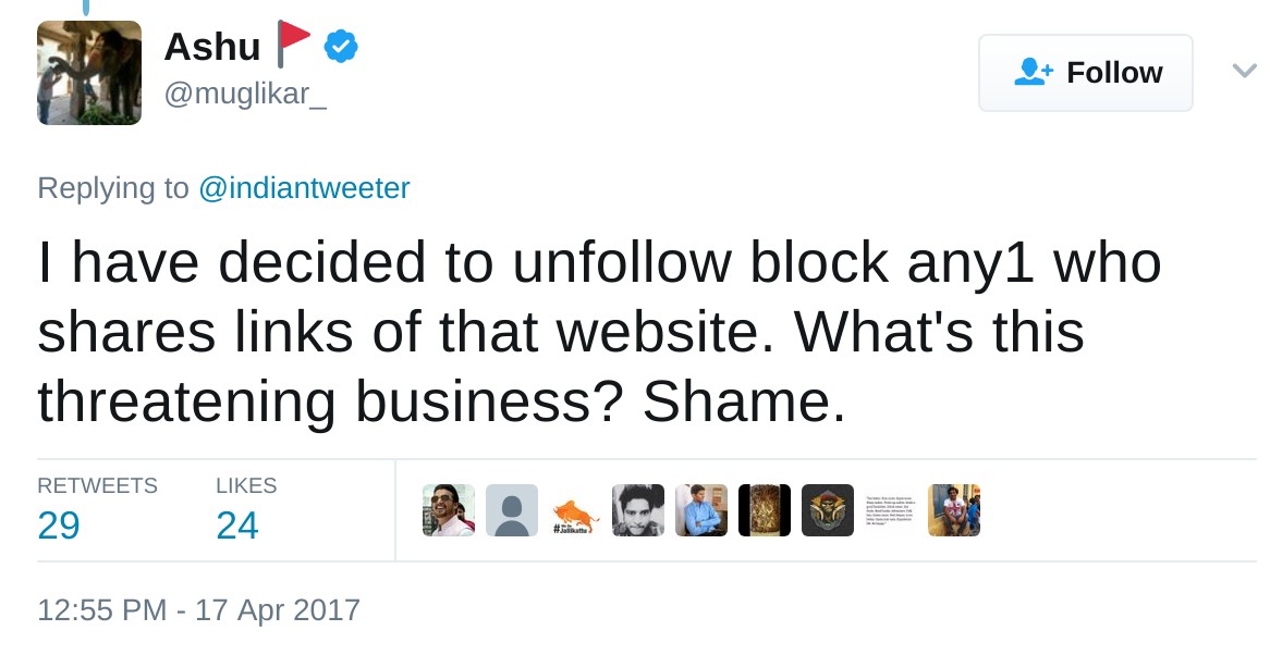 As the news of threats spread, there was a sharp reaction among the right-wingers with another Twitter user @muglikar_ tweeting that he will unfollow and block anyone who shares links of Postcard News.