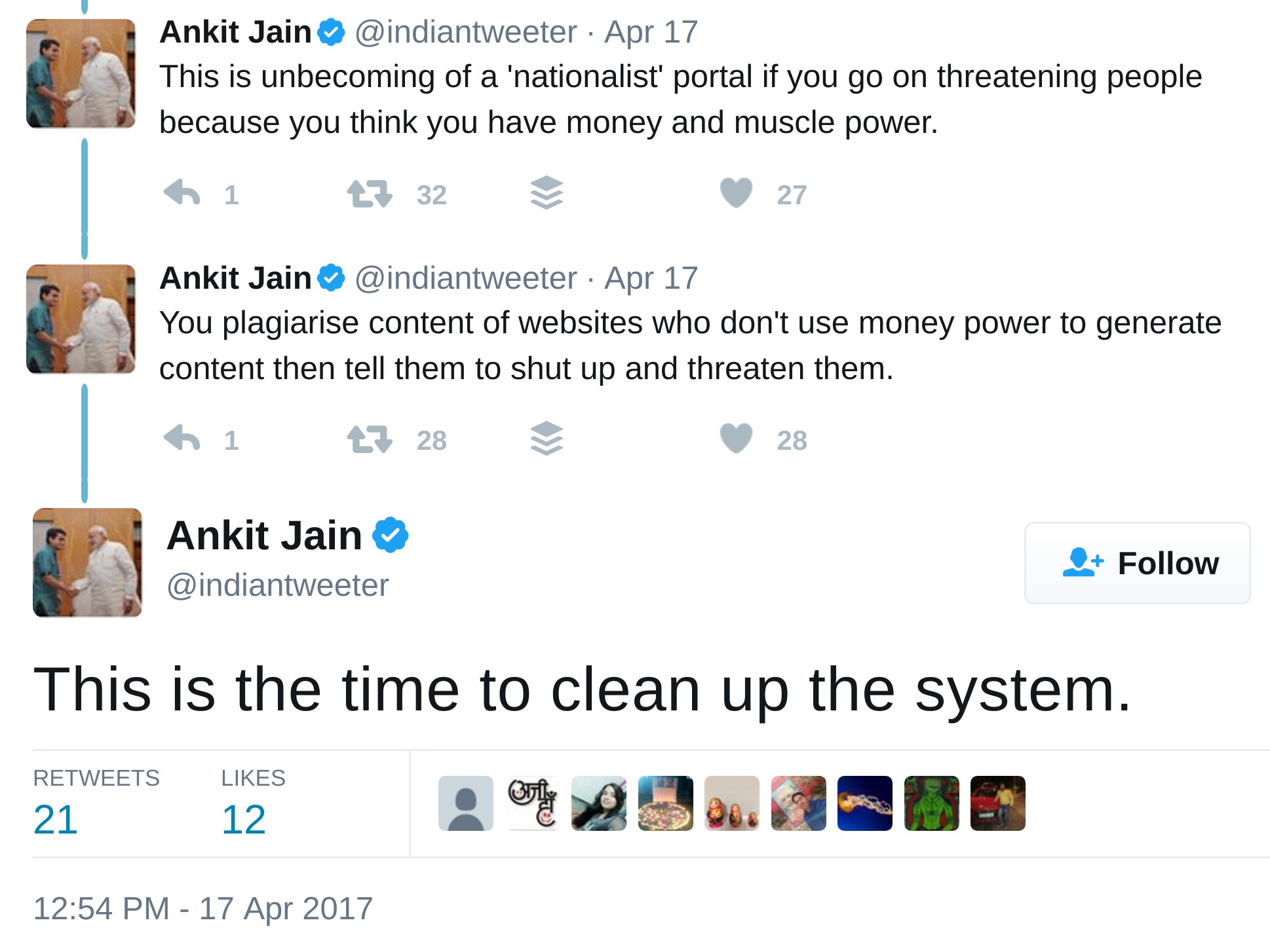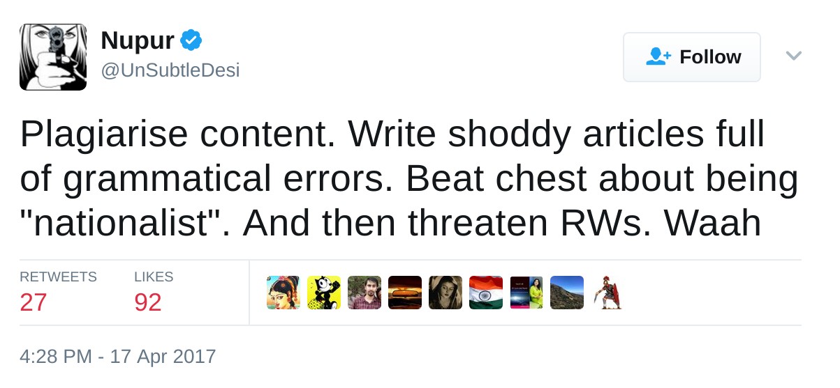 Recently, Ankit Jain (@indiantweeter), in a set of tweets has called upon fellow right-wingers to raise a voice against Postcard News for its threats and blatant plagiarism. “This is the time to clean up the system”, he said.