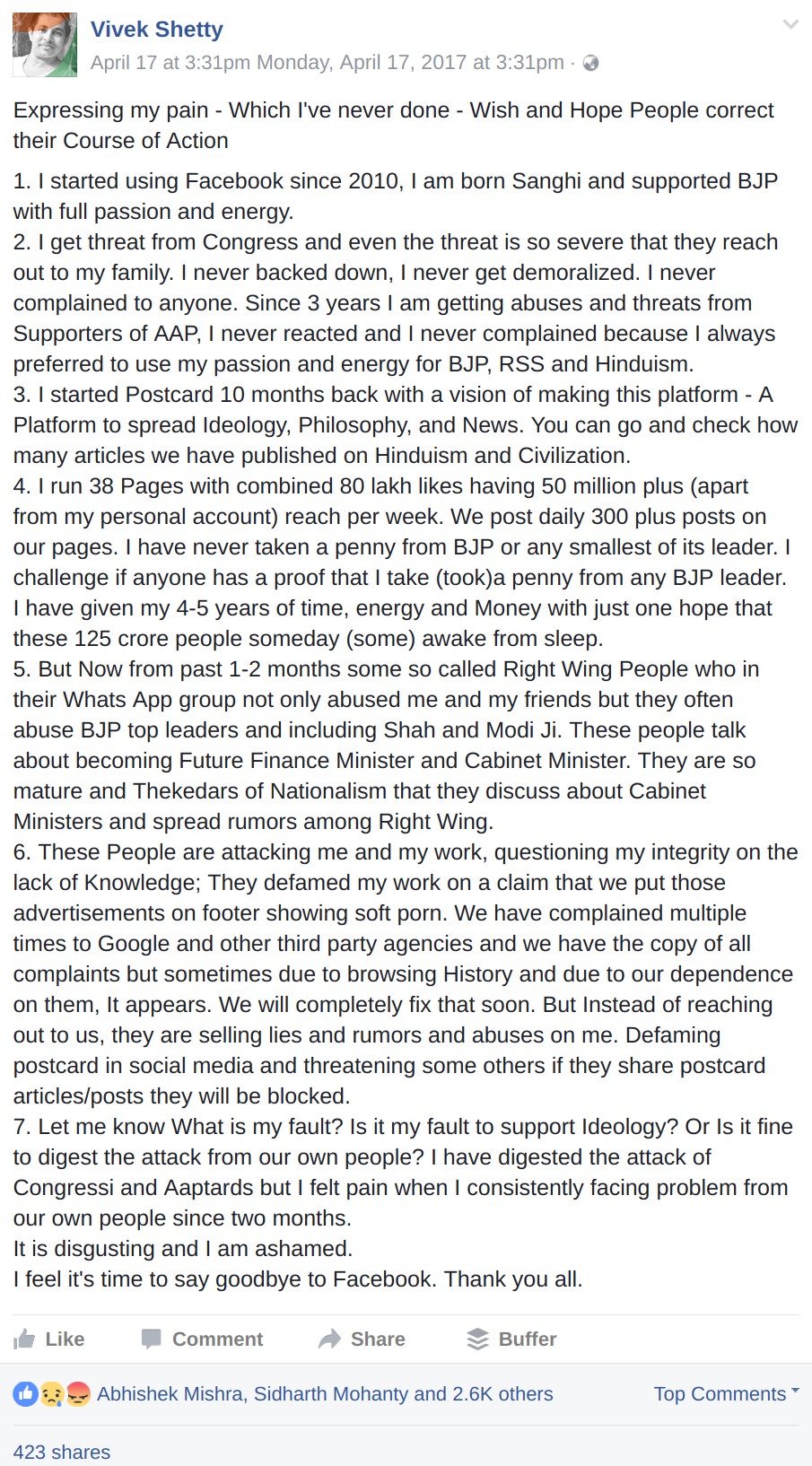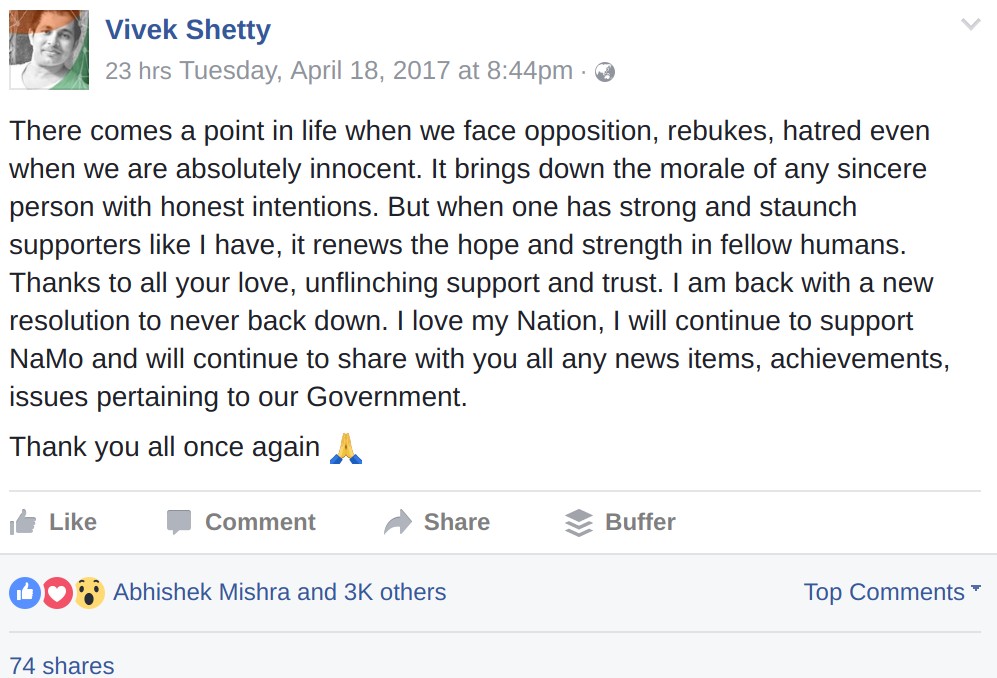 The drama continued to unfold with Vivek Shetty writing an emotional facebook post. He accused fellow right-wingers of attacking him and his work, questioning his integrity and lack of knowledge. “It is time to say goodbye to facebook”, he said.