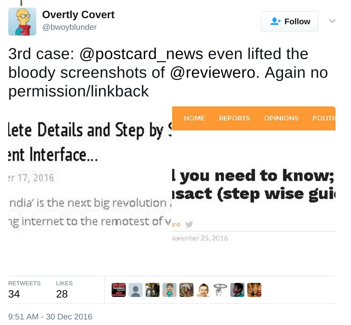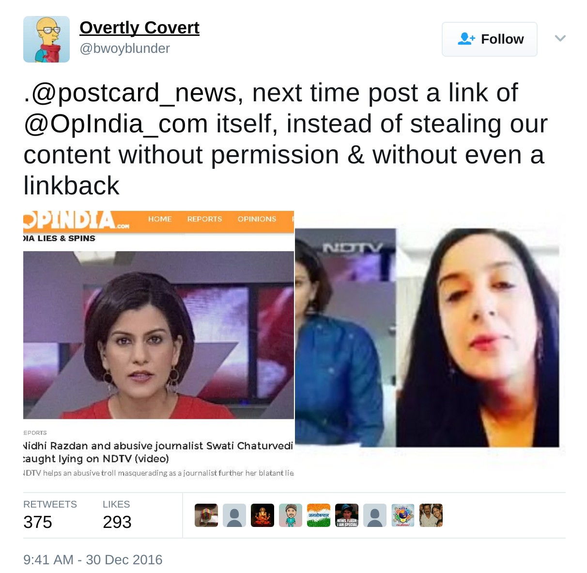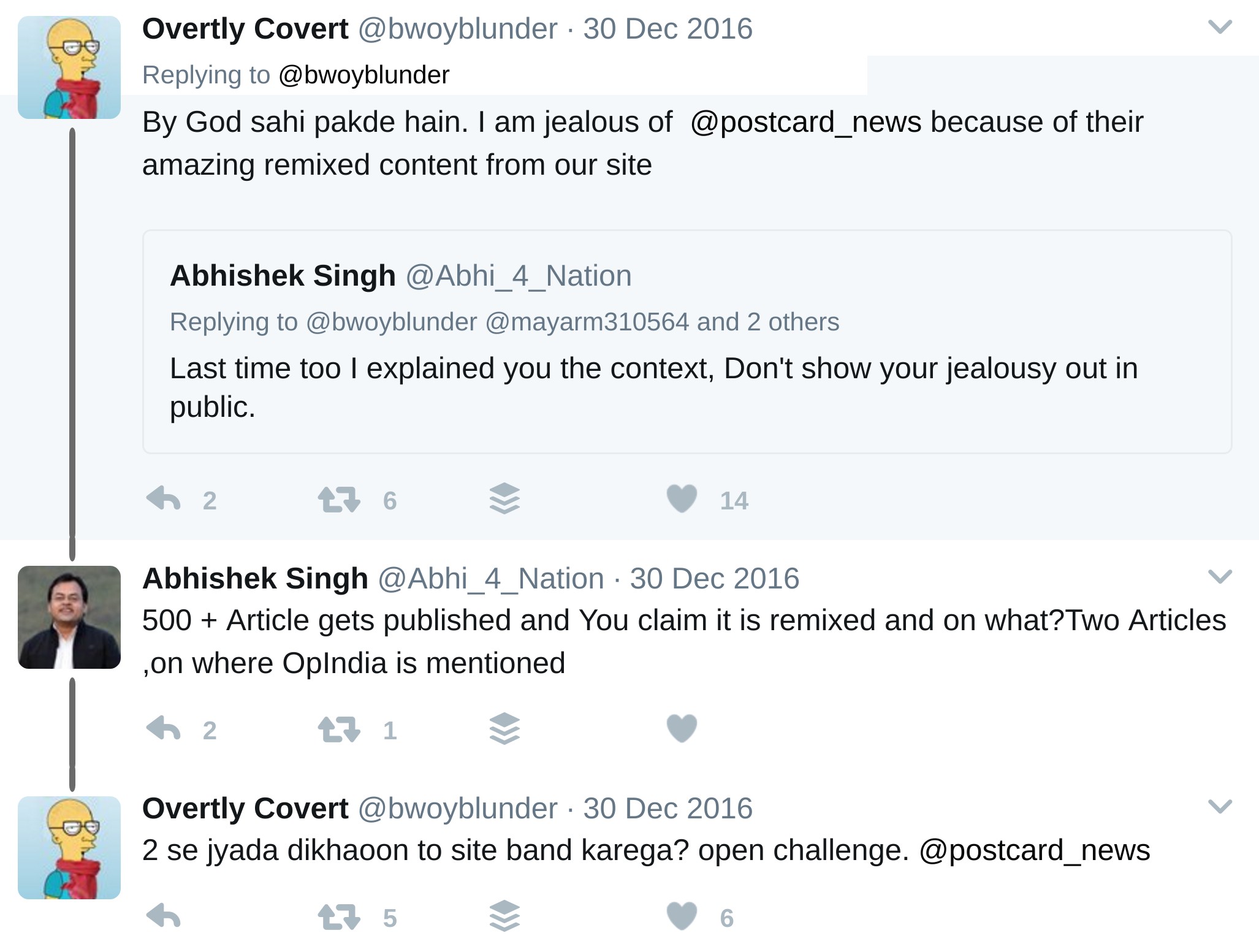 Postcard News is not new to controversy. In December 2016, postcard news was accused of carrying articles copied from another rightwing platform, OpIndia. In a series of tweets, @bwoyblunder from OpIndia accused postcard news of plagiarising their content. In the first case,they reposted an OpIndia article without permission. When confronted, they removed it. A few days later, they did it again. ”Next time post a link of @OpIndia_com itself, instead of stealing our content without permission & without even a link back”, @bwoyblunder rebuked them. Despite this, there was soon a third instance of plagiarism. The two right wing sites were at loggerheads. One may not agree with OpIndia articles but they you usually seem to be original work. The concept of crediting other other’s work was something difficult for Postcard News to understand as they continued to argue that they were only spreading the good word.