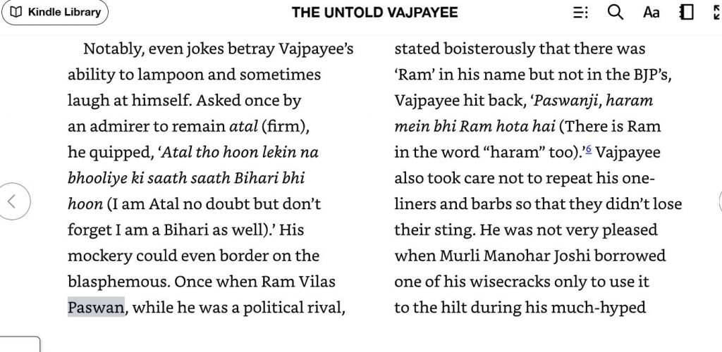Then, he made a reference to an anecdote mentioned in journalist Ullekh NP’s book The Untold Vajpayee: Politician and Paradox (Random House India, 2018). The book recounts a conversation between Atal Bihari Vajpayee and the late Lok Janshakti Party leader Ram Vilas Paswan.