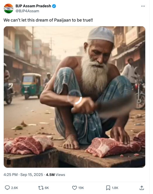 The video showed Muslim “infiltrators” entering the state and acquiring government land. The AI footage also showed men in skull caps, beards and lungis chopping beef by the roadside while Muslim men and burqa-clad women crowded the state’s tea estates and public spaces, such as the Guwahati airport, theme park, zoo, stadium and the town. The 31-second ad ended with the warning that without the BJP, Assam would have a 90% Muslim population. “Choose your vote carefully,” it said. The caption read, “We can’t let this dream of Paaijaan to be true!!”