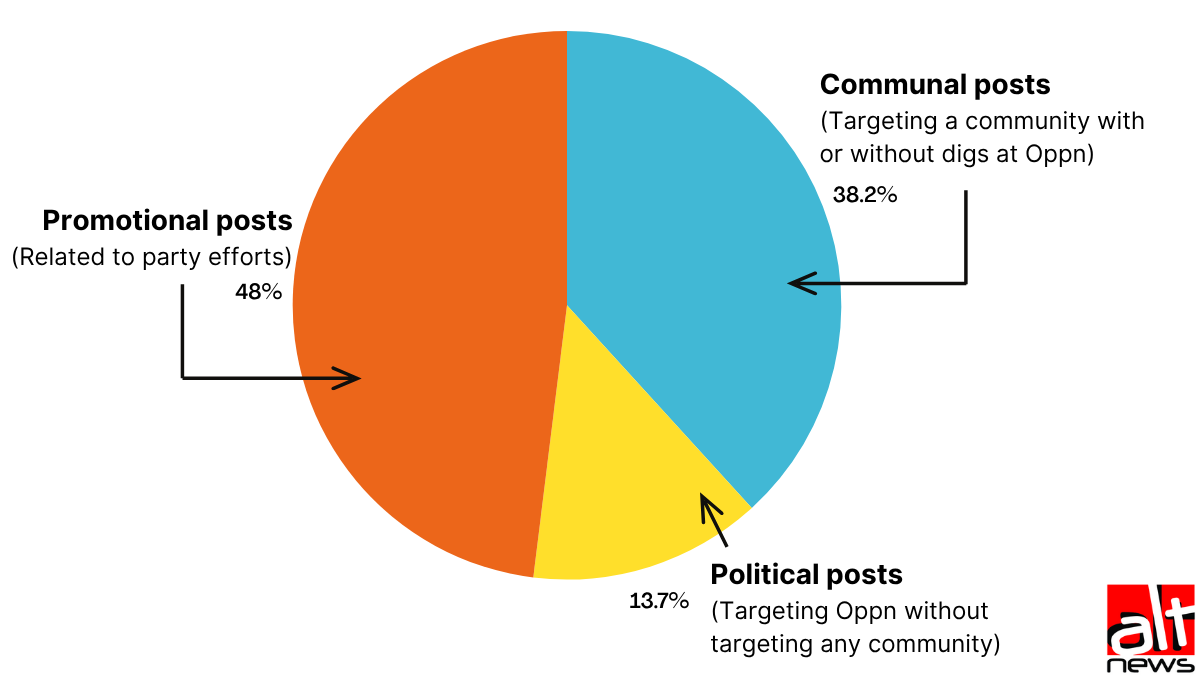 Alt News analysed 100 X posts shared by @BJP4Assam between September 1 and 12. We categorised these posts as communal (targeting a community), political (targeting the opposition) and miscellaneous or promotional (advertising the party or tributes to party leaders and celebrities).