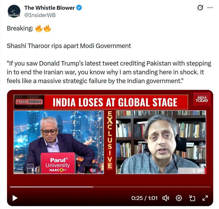 Following US President Donald Trump’s announcement of a suspension in attacks on Iran for two weeks, several pro-Pakistan accounts shared a video of Congress MP Shashi Tharoor saying that Pakistan stepping in to end the Iranian war was a “massive strategic failure by the Indian government”. In his April 7 post, Trump had mentioned talks with Pakistan’s leadership as one of the factors leading to his decision.