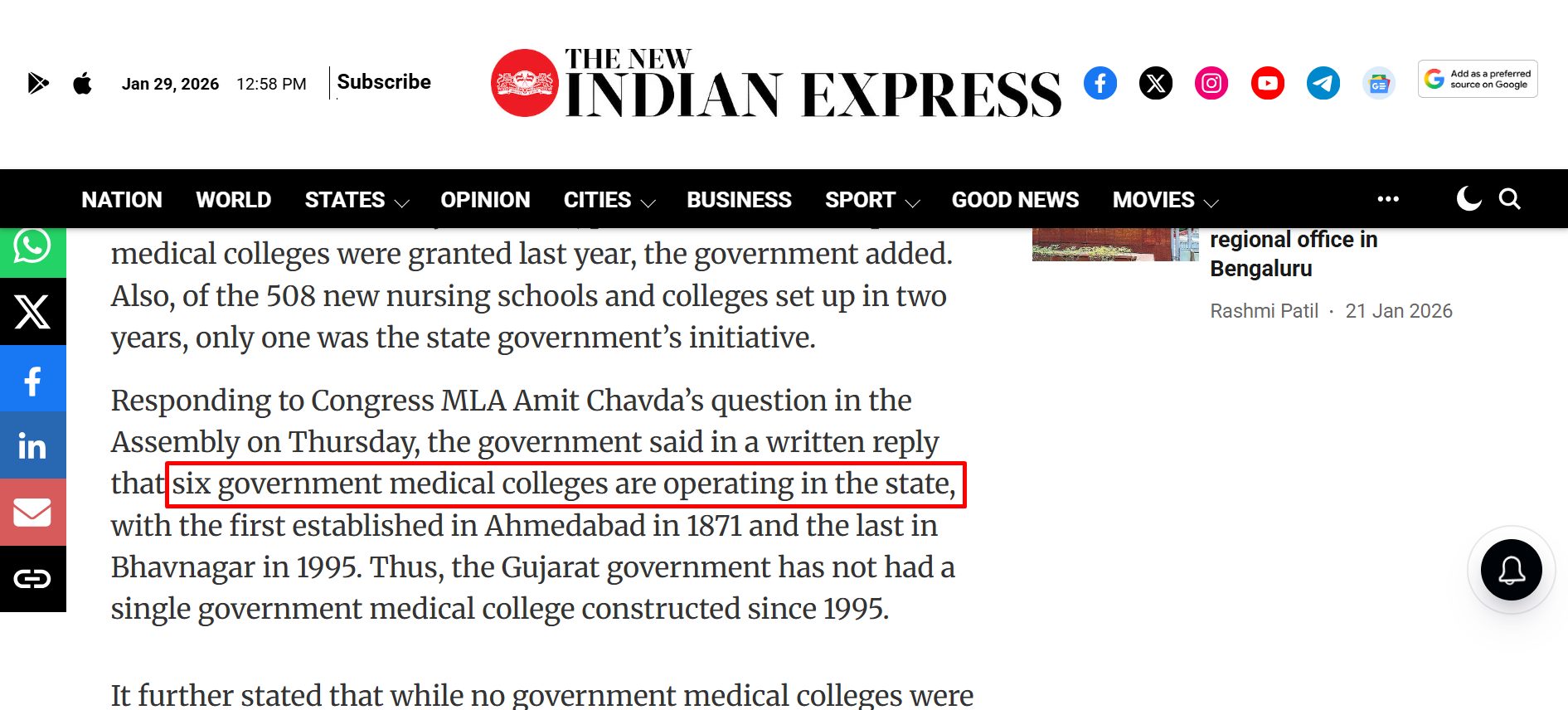 To verify the authenticity of the viral claim, we ran a relevant keyword search on Google. This led us to an article published by The New Indian Express, in March 2024. It reports that not a single government medical college has been established in the state of Gujarat since 1995. At the time of the report being published, that is, in March 2024, there were a total of six government medical colleges in operation in the state.
