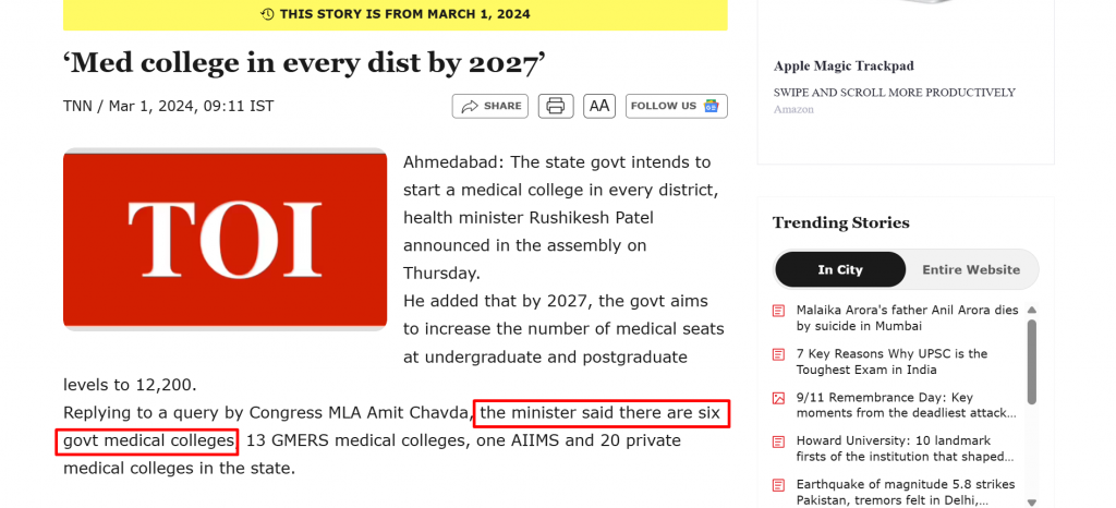 Taking a cue from this, we ran another relevant keyword search, and came across a report on The Times of India which corroborated that six government medical colleges were in operation in Gujarat. The story, published in March 2024, is based on a response by state health minister Rushikesh Patel to Congress MLA Amit Chavda’s question in the assembly. The minister clearly said that there were six government medical colleges, 13 GMERS medical colleges, one AIIMS and 20 private medical colleges in Gujarat.