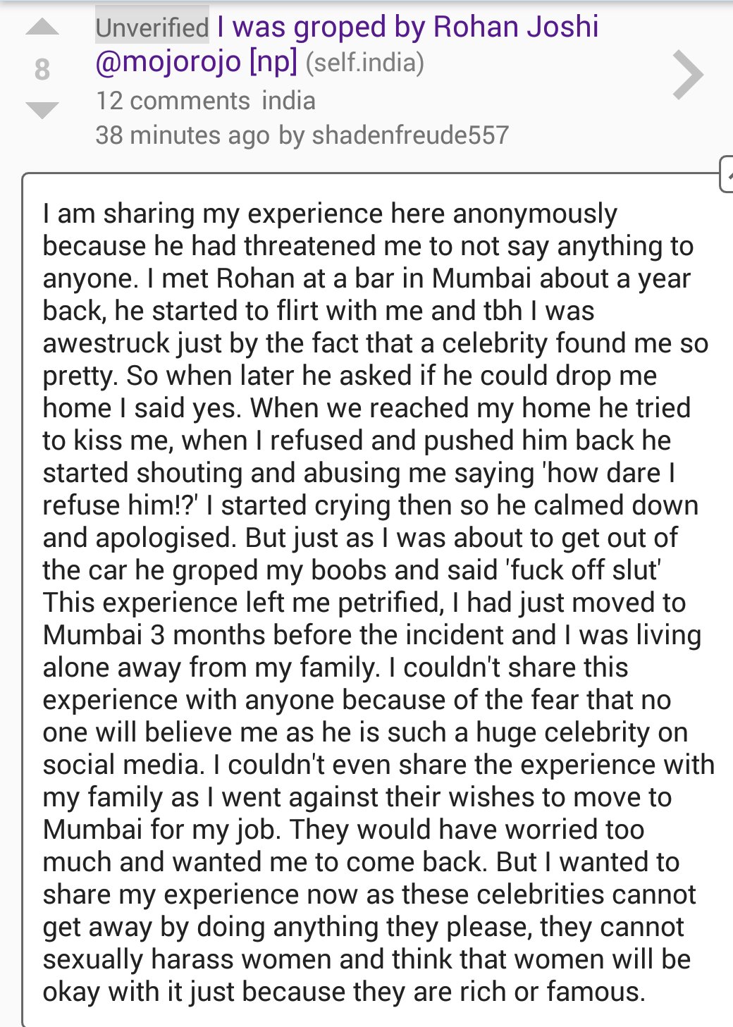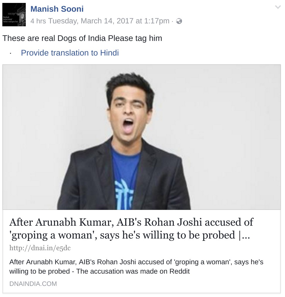 This also brings into focus the instrument used to expose a case of alleged sexual harassment – an anonymous piece of text on the interweb. In a country where the legal system crawls and is highly patriarchal, the society specialises in victim shaming, an anonymous piece of text on the interweb has often been the chosen medium by many victims to narrate their stories, especially those victims who belong to urban India and have easy access to the Internet. On the flip side, what happened with Rohan Joshi of All Indian Bakchod (AIB) earlier today is also very scary. An anonymous Redditor with the id ‘shadenfreude557’ accused Rohan of having groped her.