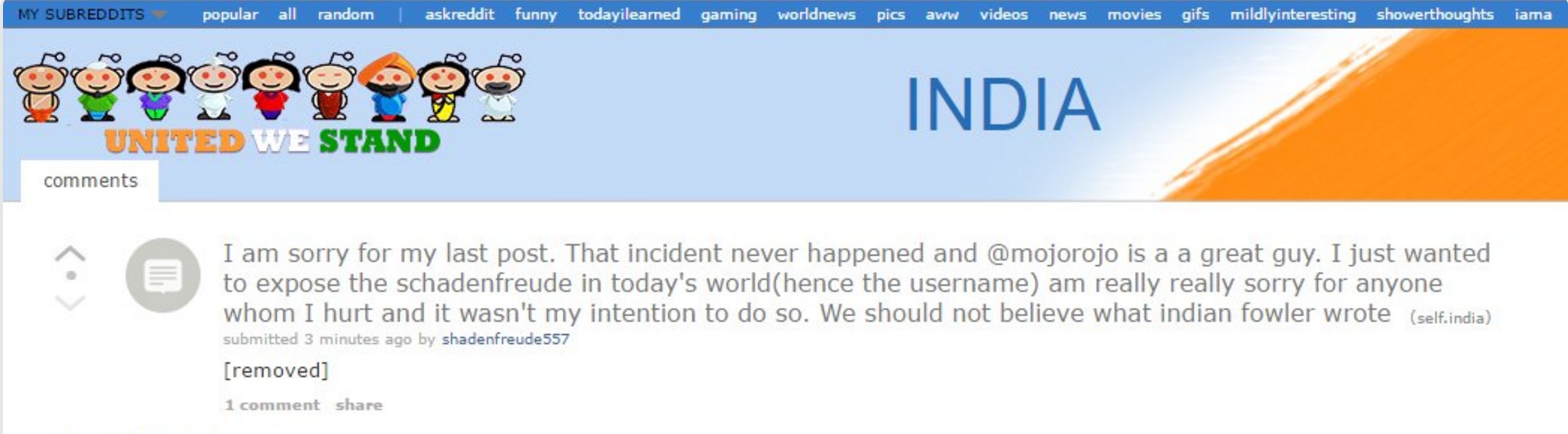 Soon after, the Redditor deleted this above post and instead posted an apology stating that the aforementioned incident never happened and that @mojorojo (Rohan Joshi’s twitter handle) was a great guy. The post goes on suggest that it was a social experiment to expose the schadenfreude in the world today and how no one should trust Indian.fowler.