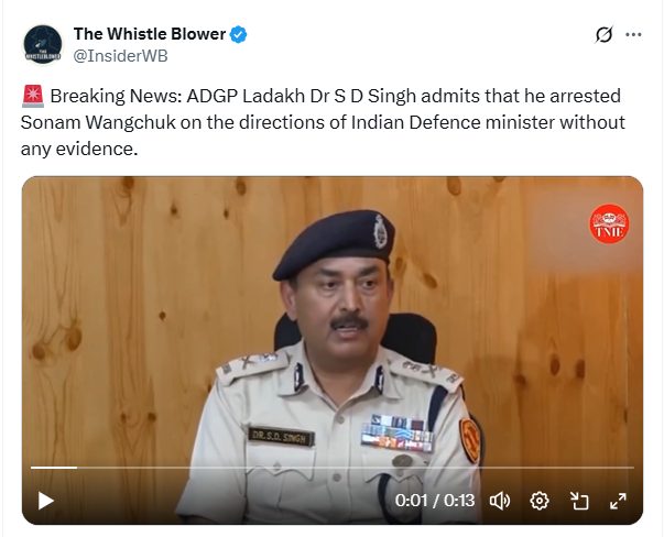 A digitally altered video of Director General of Police (DGP) Ladakh Dr. S.D Singh is circulating on social media, in which he is making claims that Sonam Wangchuk was arrested on the directions of the Indian Defence Minister without any evidence.… pic.twitter.com/vWeihURcP8