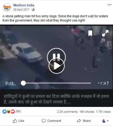 “सेना को पथ्थर मारते हुए कश्मीरी जिहादी ने दो कुत्ते को भी पथ्थर मार दिए …कुत्तो ने क्या रिएक्शन दिया है .. जिहादी पर बेरहमी से टूट पड़े … देखें वीडियो (Kashmiri jihadis, who were pelting stones at the army, also pelted stones at two dogs. See how the dogs reacted. They had brutally pounced on the jihadi. see the video -translated), reads a caption posted along with a video of a man, who was attacked by two dogs, after he threw some unknown object at them. This video was posted with the above caption by a Facebook page by the name of Facebook Media. The post has garnered close to 3, 300 shares so far.