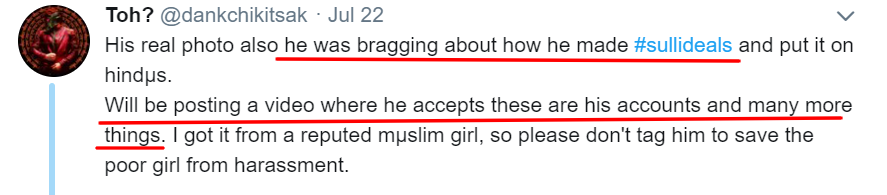 On July 22, he tweeted that Zaved Alam was “bragging” about how he made “Sulli Deals”. @dankchikitsak also wrote that he will post a video where Zaved accepts he was behind the pornographic Twitter accounts and “many more things”.
