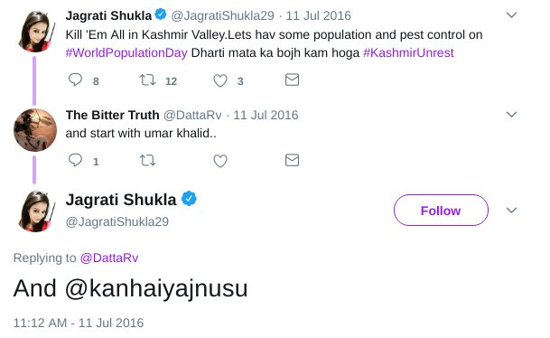 Shukla seems to have a morbid fascination for genocide, killings and murders. Other than justifying the anti-Sikh riots, she had also called for genocide in Kashmir. In a 2016 tweet, she had called for “population and pest control” by killing “‘em all” in the Kashmir Valley. She later added that they could start by killing Kanhaiya Kumar.