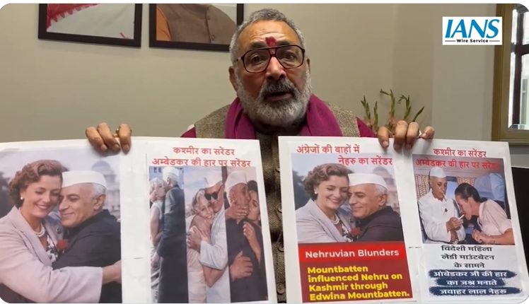 #WATCH | Delhi | Union Minister Giriraj Singh says,” To fulfil his own aspirations, Nehru ji mortgaged Kashmir. He also surrendered to the British. These photos explain everything. Rahul Gandhi should apologise to the nation.” pic.twitter.com/O9JzvHkqdJ