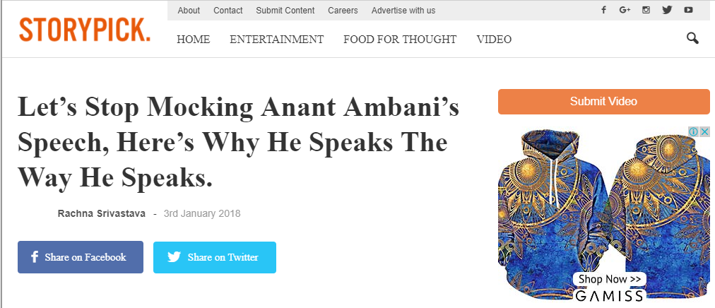 DailyO mocked these two publications for deleting the story. In its article it said, ‘Cut to 2018, and a Google search on Anant Ambani now throws up a few more articles, two of which (from ScoopWhoop and StoryPick) have now mysteriously disappeared. Why the sudden spike in popularity for the Young Ambani of House Reliance Jio? As it turns out, he’s become a meme’