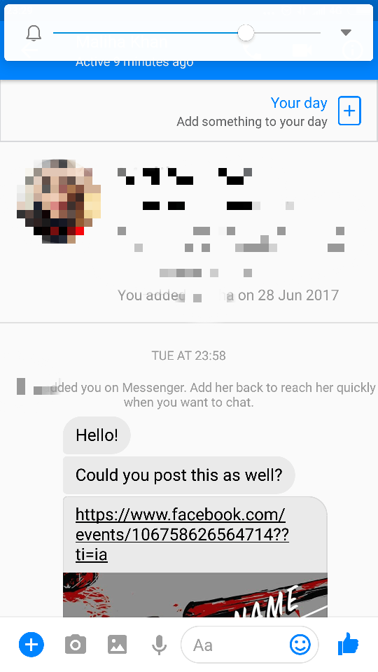 He also sent us the screenshot which shows that it was Adeeba who got in touch with him. She writes to him, “Hello! Could you post this as well. We are organizing a protest in Karachi as well.” It is clear that it was Adeeba who reached out him and not the other way round as twisted by Times Now.