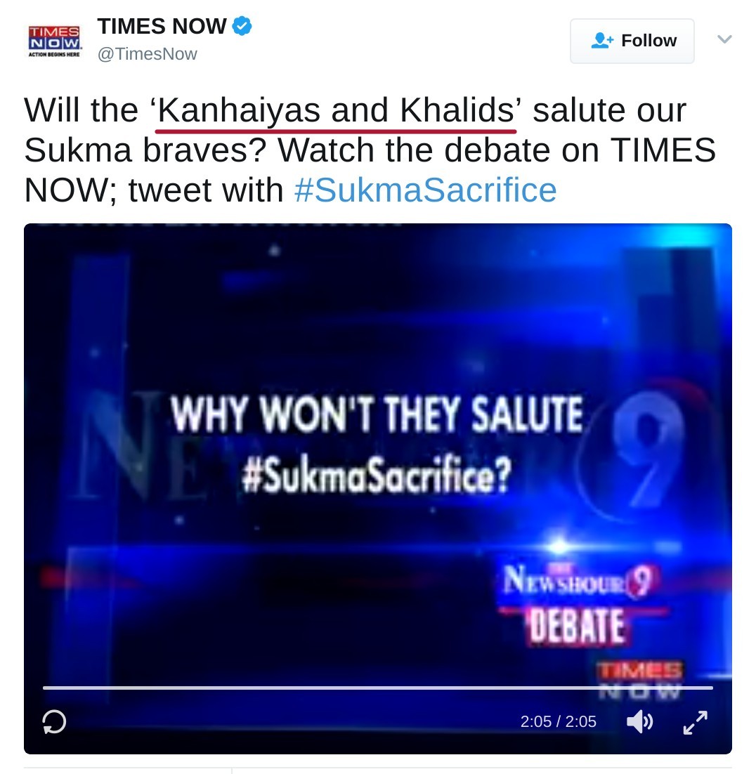 Will the ‘Kanhaiyas and Khalids’ salute our Sukma braves? Watch the debate on TIMES NOW; tweet with #SukmaSacrifice pic.twitter.com/BfemqKtXKm
