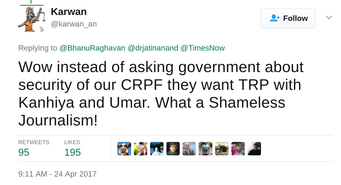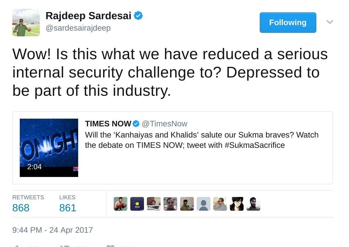 @TimesNow In April 2014, when attack happened in Sukma, Times Now questioned then Union Govt, in 2017, they're questioning student leaders. pic.twitter.com/vAL3PSDn5i