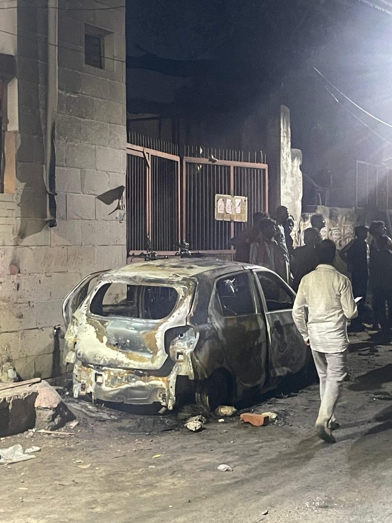 When Alt News visited JJ Colony’s A Block in Uttam Nagar East on Saturday, the narrow lanes of the neighbourhood were still heavy with tension, days after the violence. Police personnel stood guard at several corners, small groups of residents spoke in hushed tones, and charred remains of vehicles bore witness to the unrest that had followed.