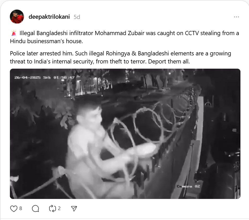 X user Baba Banaras (@RealBababanaras) shared the video. He identified the man as Mohammed Zubair and said he was an illegal Bangladeshi infiltrator who was later arrested for stealing from a Hindu businessman’s house in India. The user expressed concerns over the “growing threat to India’s internal security, from theft to terror”, due to the presence of illegal Rohingyas and Bangladeshis. (Archive)