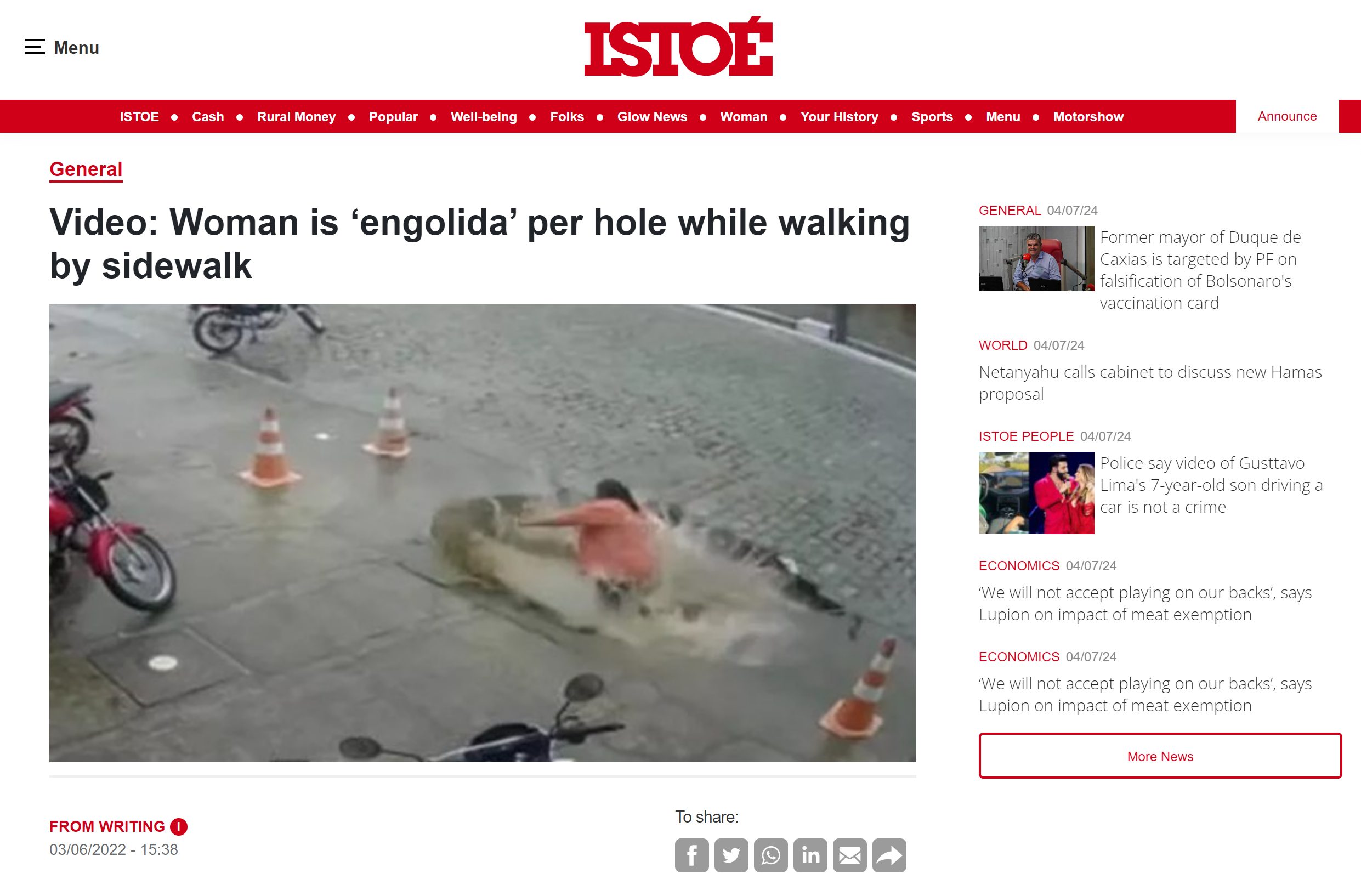 We performed a reverse image search using frames from the viral video on Google. This led us to an article on the Brazilian magazine ISTOɑs website, which had been published on June 3, 2022. According to this report, 48-year-old Maria Rosilene Almeida fell into a water-filled hole while walking on a sidewalk in Cascavel, Fortaleza (CE). In an interview, she mentioned that she had not noticed the safety cone placed there.