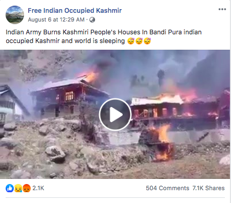 On August 6, 2019 Facebook page Free Indian Occupied Kashmir posted a video of houses on fire with a message that reads, “Indian Army Burns Kashmiri People’s Houses In Bandi Pura Indian occupied Kashmir and world is sleeping”. The post has amassed over 7,100 shares so far. It is being claimed that the Indian army burnt houses of Kashmiri people in Bandipora district of J&K. This comes in the backdrop of the scrapping of J&K’s special status under Article 370.