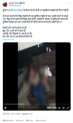 Twitter Blue user Sanju Tiwari 🕉️ (@SanjuTiwarri) shared this video on June 5 with a Hindi caption that can be translated as: “Cases of #love_jihad are happening daily all over the world but girls are not ready to understand. This is a case from Meerut, this Hindu girl was caught in her room with a Muslim boy. Hindu organizations are calling it love jihad. The girl’s family told the police that the Muslim boy repeatedly threatened their daughter to make her photo viral. Shamelessness and filth beyond limits. Lies and unrighteousness are the way to be now. Terrorists and Jihadis have been friends. People are even ready to sell off their country and religion.” The tweet has received over 1.2 lakh views and has been retweeted over 300 times. (Archive)