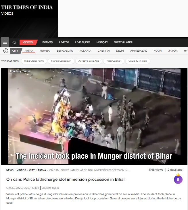 Alt News performed a Google search with keywords ‘Durga Puja police lathi charge’ and found a report by The Times of India published on October 26. It stated that the incident took place in Munger district of Bihar.