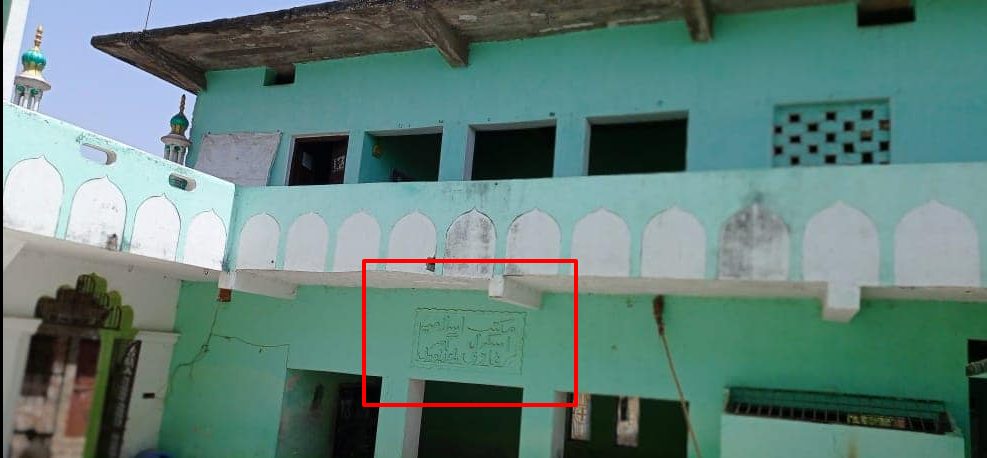 In one of the images on Uzma’s post, we can spot Urdu text inscribed on a wall of the masjid. The first line says “Maqtab-e-Islamiya”, the second line says “school” and the first word of the third sentence says “Gahmar”.