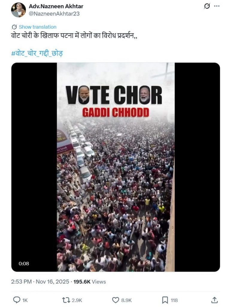 A user named Nazneen Akhtar posted the video claiming that people in Patna were protesting against ‘vote theft’. (Archive link)