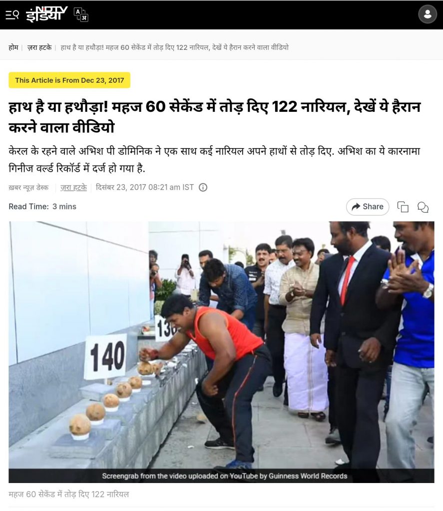 We then found a news report by NDTV India from December 23, 2017 featuring this video. The report says that the video shows Kerala resident P Dominic breaking 122 coconuts with his bare hands in just 60 seconds. The feat was recorded by Guinness World Records, the report adds. (Archived link)