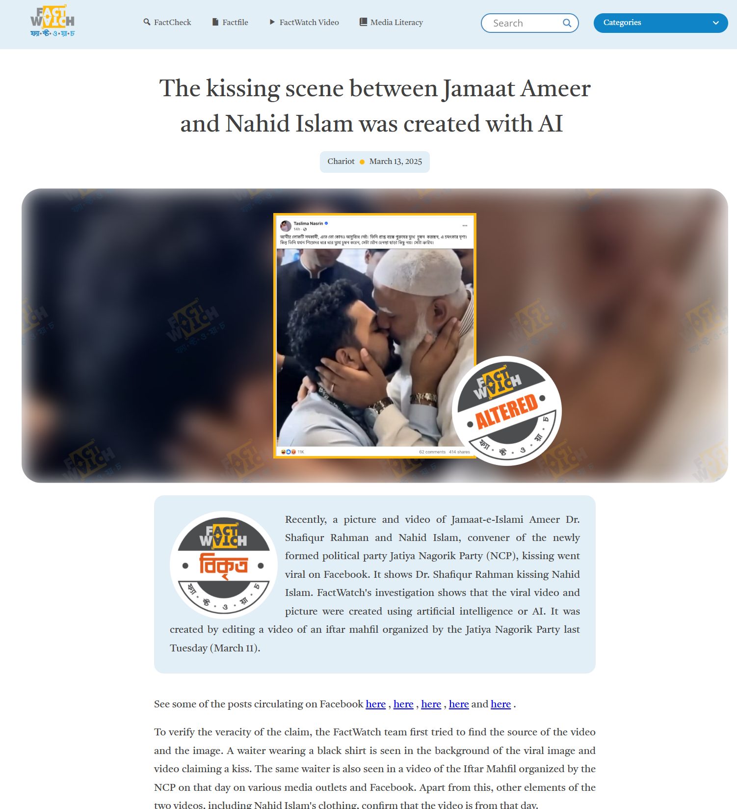 To verify this claim, we ran a relevant keyword search and we came across several reports by Bangladeshi media outlets where they have fact-checked the image. We found a report by the newspaper The Daily Ittefaq from March 13 which was titled: “The kissing scene of the ameer of Jamaat and Nahid Islam has been created using AI”. According to the report, the footage is from an Iftar gathering organized by the National Citizen Party.