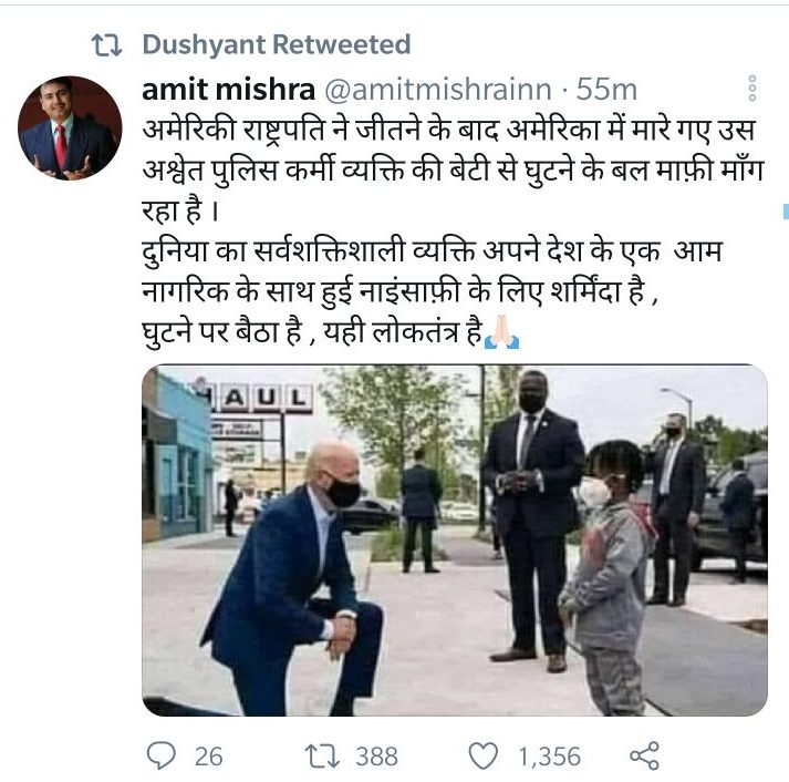 Other Congress leaders who shared the photograph writing, “The world’s most powerful person is ashamed of the injustice faced by his country’s citizen.” (दुनिया का सर्वशक्तिशाली व्यक्ति अपने देश के एक आम नागरिक के साथ हुई नाइंसाफ़ी के लिए शर्मिंदा है.), were MLA Shakuntala Sahu and chairman of Rajasthan Youth Congress Social Media Satyaveer Aloriya.