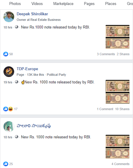 On Facebook, several individual users have posted these images with the identical claim. The 1000 rupee currency note had been discontinued by the government following the announcement of demonetization in November 2016.