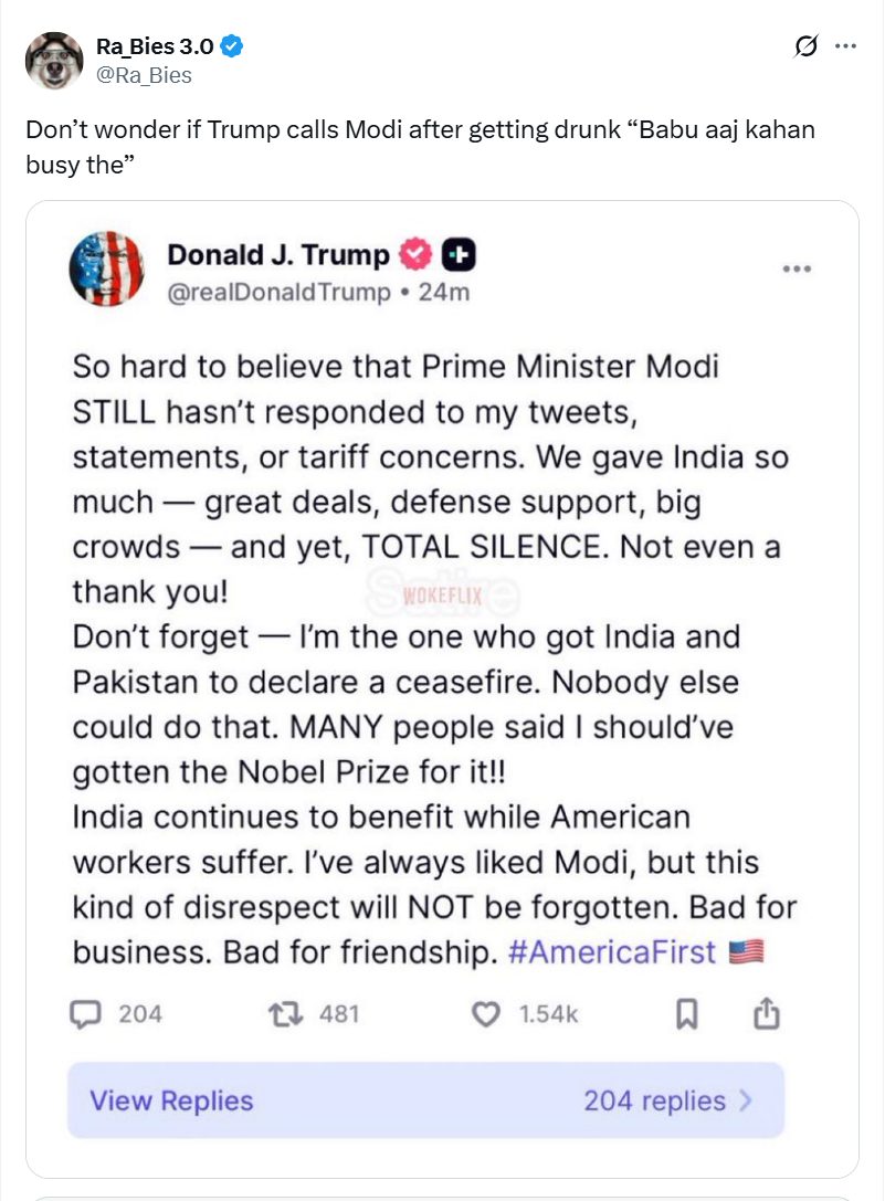 The viral screenshot of Trump’s second post, claiming that PM Modi had not responded to his tariff concerns or thanked him despite his contributions, including brokering the ceasefire with Pakistan, was shared by several users on X; some said he was behaving like a “jilted lover”. (Archives 1, 2)