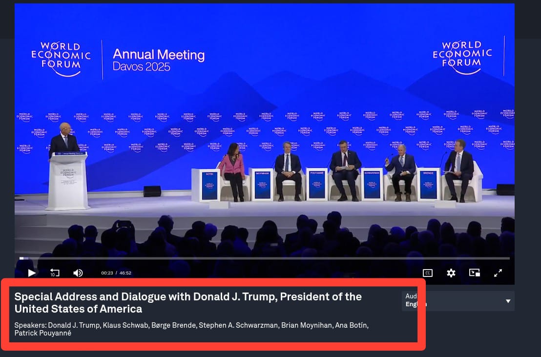 The other speakers on January 23, 2025, were WEF founder Klaus Schwab, CEO Børge Brende, American businessman Stephen A Schwarzman, president of Bank of America Brian Moynihan, Spanish banker Ana Botín, and French entrepreneur Patrick Pouyanné.