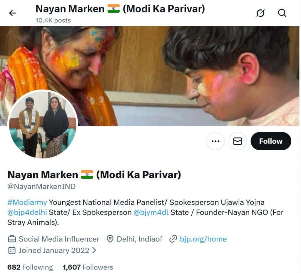 We traced Marken’s social media profiles. They reveal explicit political affiliations. His X bio describes him as a “Youngest National Media Panellist/Spokesperson Ujjwala Yojna @bjp4delhi” and a former spokesperson of the BJP Yuva Morcha’s Delhi unit.